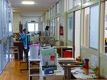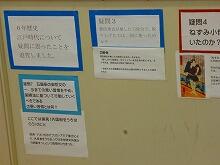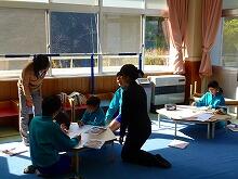 | 保健委員会です。クイズがわからなかったら、ヒントもいるだろうということで、それをどうしようか悩んで、みんなで顔突き合わせて考えてます。 | 図書委員会です。大まかなレイアウトが決まり、文字を書いたり絵を張ったりと作業が進んでいるようですが、途中で赤マジックが出なくなって困った! |