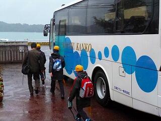 | バスに乗り現場に到着です。 まずは安全のため、ヘルメットをかぶります。 | 係の方から、トンネル工事について説明を受けました。 浦底から白木までトンネルが掘られます。 | さて、いよいよ探検開始。トンネル入り口にある二重の扉をくぐって、トンネル内へ | 周りは、見たことのない景色。いろんなものが置いてありました。 | さらに奥へと進みます。右手には、土や岩を運び出すベルトコンベアーも見えます。 上からは雨水がポチャリと落ちてきます。 | ||||