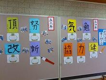 | 4人でワイワイ話しながら登校してきました。安全のため、周りも気をつけてよ! | 6年生がいなくなり一人だけになりました。今日は朝日がまぶしく、うつむき加減の登校です。まぶしいくらい素敵な笑顔で挨拶してくれました。 | いつもと同じように、スクールバスで登校です。明るいあいさつは、聞いている人を元気にしてくれます。 | 業間の時にお願いしたものです。 3・4年生には、一人1~2文字ずつ書いてもらいました。これ何? | |||
