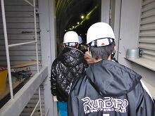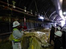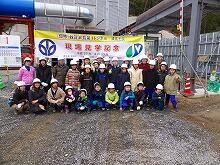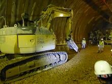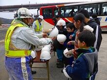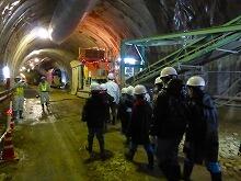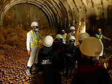 | バスに乗り現場に到着です。 まずは安全のため、ヘルメットをかぶります。 | 係の方から、トンネル工事について説明を受けました。 浦底から白木までトンネルが掘られます。 | さて、いよいよ探検開始。トンネル入り口にある二重の扉をくぐって、トンネル内へ | 周りは、見たことのない景色。いろんなものが置いてありました。 | さらに奥へと進みます。右手には、土や岩を運び出すベルトコンベアーも見えます。 上からは雨水がポチャリと落ちてきます。 | ||||