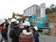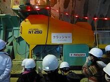 | クラッシャーという機械です。砕かれた土砂をベルトコンベアー用の台車に載せていきます。 | 人の大きさと比べてください。 先端のハサミで、大きな岩などを処理するようです。 | ここが一番の奥。 正面には、壁というか掘られていない土が見えます。ここは山の中(土の中)ということを改めて意識しました。 | 見学が終わり外へ出ました。 トンネル内は風もなく、思った以上に温かく感じました。 | 最後はみんなで記念撮影です。 常宮小の友だちも一緒でした。 | ||||