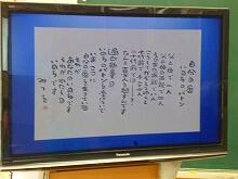 | 4人でワイワイ話しながら登校してきました。安全のため、周りも気をつけてよ! | 6年生がいなくなり一人だけになりました。今日は朝日がまぶしく、うつむき加減の登校です。まぶしいくらい素敵な笑顔で挨拶してくれました。 | いつもと同じように、スクールバスで登校です。明るいあいさつは、聞いている人を元気にしてくれます。 | 業間の時にお願いしたものです。 3・4年生には、一人1~2文字ずつ書いてもらいました。これ何? | |||