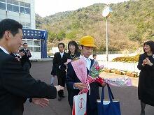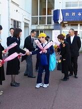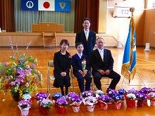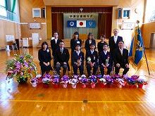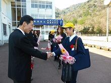 | 最後には、全員が入っての記念撮影となりました。 | 暖かな日差しとがっこうのみんなに見送られ、卒業生たちが巣立っていきます。 | 最後は、やはり担任との握手です。 | みんなからお花などたくさんもらって、両手はいっぱいです。お祝いの気持ちもたくさんもらいました。 | 学校の向こうにある水島は、いつもと変わらずみんなを見守っていますよ。 |