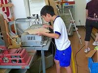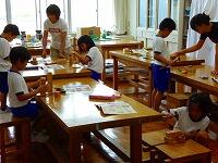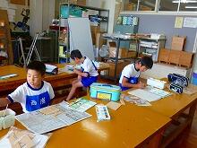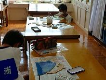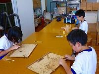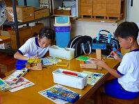 | 以前、糸のこを使って切っていたものに色をつけていますいくつかの部品があるようです。 | 重ね塗りをしたいので、乾くまで少し待たなくては。 (体操服に「西浦」のゼッケンが付いています。図工の時間が終わったら、バスで会場に向かいます) | |