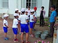| 役割を分担して、水やりと後片付け。手際もいいです。 | 植えた苗は420本とのこと。 うえた人数は、9人+5人かな。 1人30本ほど植えましたね。 | 3・4年が植えてくれた花壇です。 まだ花はちらほら。一月後が楽しみです。 |