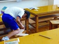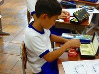 | 余りのある割り算の習熟のために、カードを作って練習中です。50問を3分以内でという目標に向かって頑張っています。 | まとめのテスト中です。これまでの学習を思い出しながら、解いています。 | |