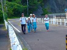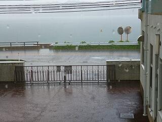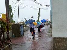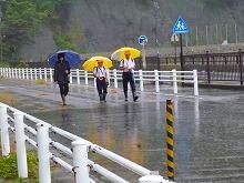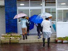 | 長靴で隠れている部分は大丈夫ですが、服がぬれるのは傘では防ぎきれません。雨風でもしっかり集団登校です。 | 海岸沿いを歩くため、横なぐりの雨が襲ってきます。 | 学校へ着いて、付き添った職員もほっと一息! | ||||||