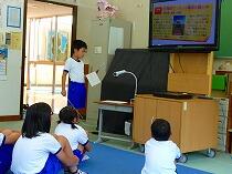 | ”オカピ”というキリンのようなシマウマのような動物の紹介です。世界三大珍獣の一つだそうです。 | ほとんどの子どもたち(職員も)が初めて知ったようです。たくさんの感想や質問が出ました。 |