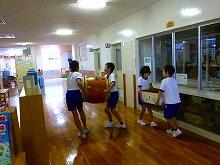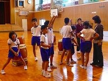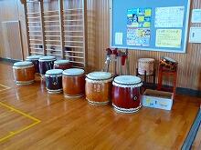 練習を始めるために、業間の時間、1階の作法室(西浦小学校には作法室があります。お茶なども立てられますよ)にある太鼓を、2階の体育館まで運びました。子どもたちも太”ばち”や太鼓をのせる”台”などの小物を運んでくれました。6年生は太鼓そのものを運ぶのに力を貸してくれました。