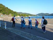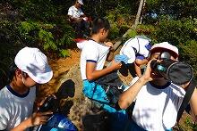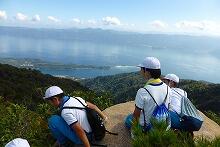 台風一過の絶好の日和でしたが、結構傾斜もあり、始めは意気揚々と登りだしましたが、途中の「長命水」の場所までに木の根の階段や大きな石の階段など、一つ一つ大きな障害?を越えていくうちに疲れも出てきて、子どもたちの会話も「元気にしりとり→ちょっと無口に→学校で勉強をしてた方が→帰りたい」とものの見事に変わってきたとか、こないとか。真偽のほどは分かりませんが、無事頂上に着いて、山頂から見た西浦にとても感慨深い様子でした。