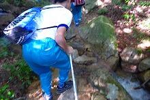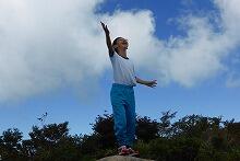 | 頂上の岩に登り、思い切り空をつかもうと‥‥ | みんなで記念撮影ももちろんです。 | 急な登りは、急な下り。気をつけて | 杖は必需品。みんなそこらの木の棒を杖代わりにしていました。 | 無事学校前に到着です。ニコニコ笑顔でした。 |