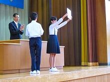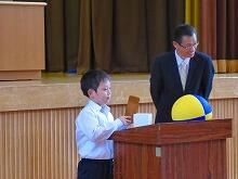 | 終業式に先立って表彰がありました。読書感想文で入賞しました。 | こちらは、近視ポスターです。 | 救急に関するポスターで入賞しました。 | 大きさに惑わされない。脳を使って神経をつないで使っているところをいっぱいにしないともったいない。 | ゆっくり休んで2学期に元気に来ること、読書をすること、台風が近づいた時は出歩かないこと。どれも大切です。 |