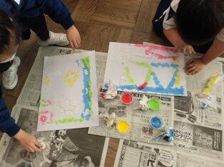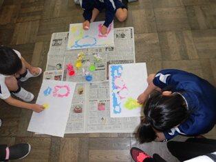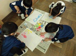 図工の時間にシール版画を作りました。まずはじめにシールを好きな形に切り、画用紙に貼りました。次にシールを貼っていないところに黄色や赤、水色、緑などの明るい絵の具をたんぽでつけていきました。自分で海の中や学校の様子などテーマを決めて、楽しく製作することができました。みんな色とりどりの素敵なシール版画ができあがりました。