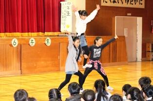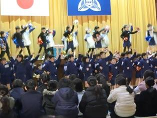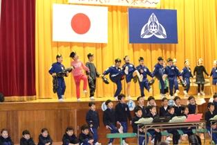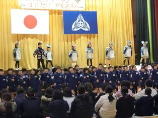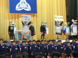 今日は6年生を送る会でした。今までお世話になった6年生に感謝の気持ちを伝えようと、1年生は「おむすびころりん」の劇をプレゼントしました。おじいさんが穴に落っこちてしまいました。落ちたところは、6年生が2年生だったときの体育大会。おじいさんは、6年生(2年生)と一緒にダンスを踊りました。きっと、6年生も懐かしく感じてくれたはずです。 劇のセリフもダンスもとっても上手な1年生でした。