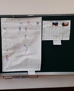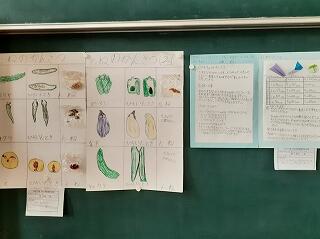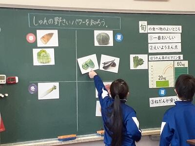 子どもたちは、野菜の旬がどの季節なのかを考えて、黒板に貼っていきました。