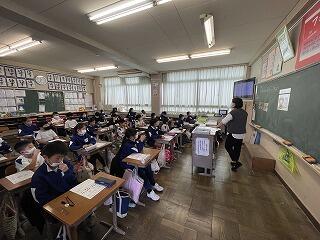 5年生が国語「提案しよう、言葉とわたしたち」で、タブレットを活用した学習をしていました。「主語や述語をちゃんと入れて使ってる?」「若者言葉は分かりやすい?」など、各自が決めたテーマでアンケートをとったりインターネットで調べたりして、その結果をタブレットで示しながら発表しました。目と耳を働かせながら、発表し合っていました。