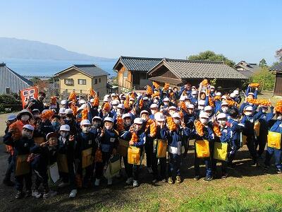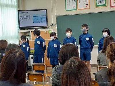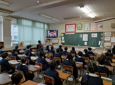 6年生からは、「地味にすごい福井」「地味にすごい中央小」のVTR紹介の後、「ありがとうの花」の映像で在校生への感謝の気持ちを表しました。
