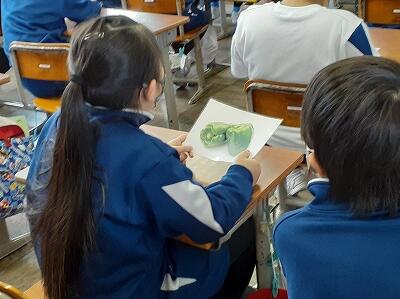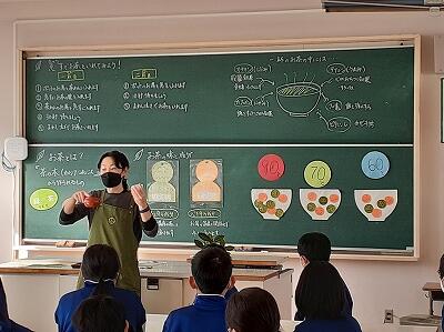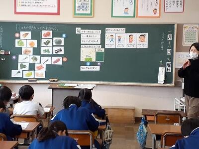 栄養教諭の先生に、3年生が栄養指導をしていただきました。今回のテーマは、「旬(しゅん)の野さいパワーを知ろう」です。