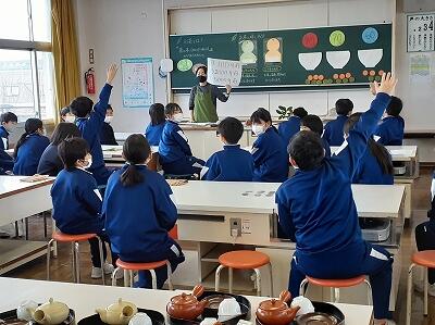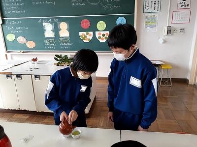 5年生が家庭科の学習で、お茶について学びました。ゲストティーチャーをお招きし、お茶の歴史、種類、味や成分、おいしいお茶の入れ方について教えていただきました。
