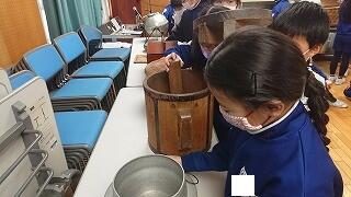 社会科「市の移り変わり」の学習のために、50年前から100年前に実際に使われていた道具を、敦賀市立博物館から貸していただきました。