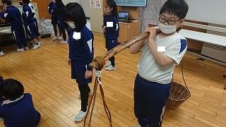 次に、おひつや洗濯板、そろばんなどの道具に触れたり、ぱいすけ(天びんかつぎ)を担いだりしました。