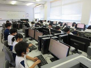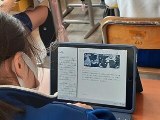 6年1組は、総合「地味にすごい福井」で、タブレットを活用しての新聞づくりでした。各自テーマを決めて検索し、写真を貼ったり説明文を書いたり。本時は、「分かりやすい新聞」を目標に、字の大きさや色を変えたり吹き出しを加えたり、工夫していました。