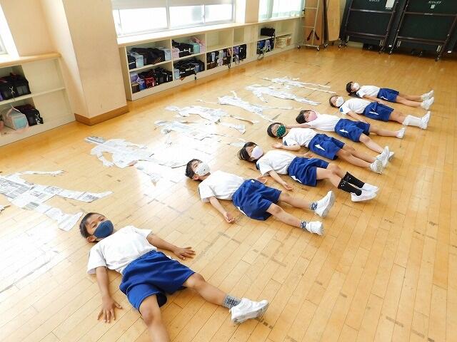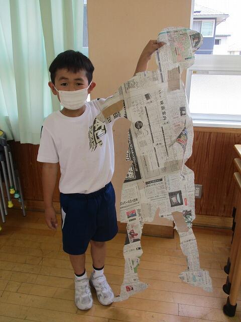 図工の時間に新聞紙を使って、体の型取りをしました。