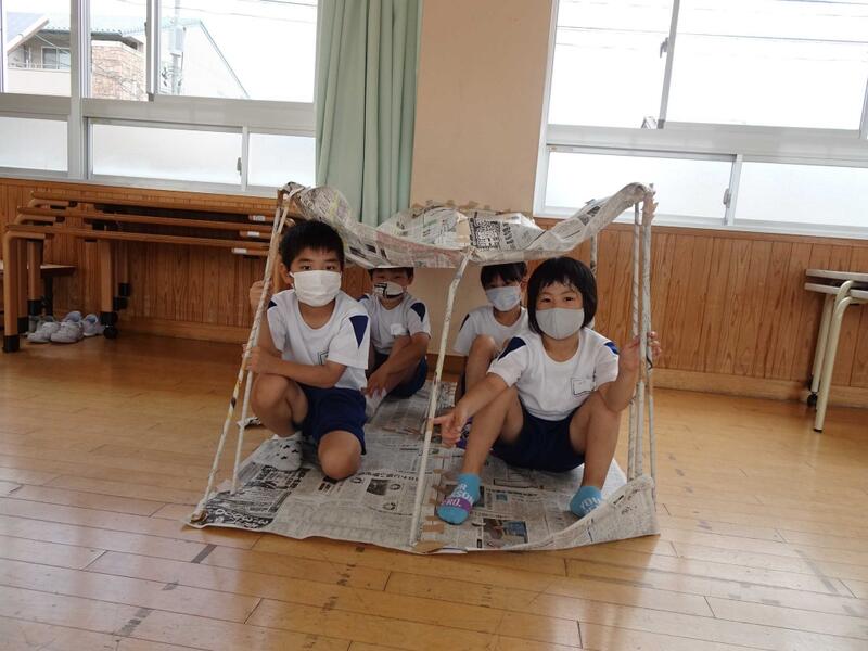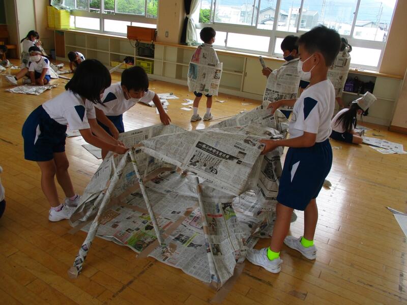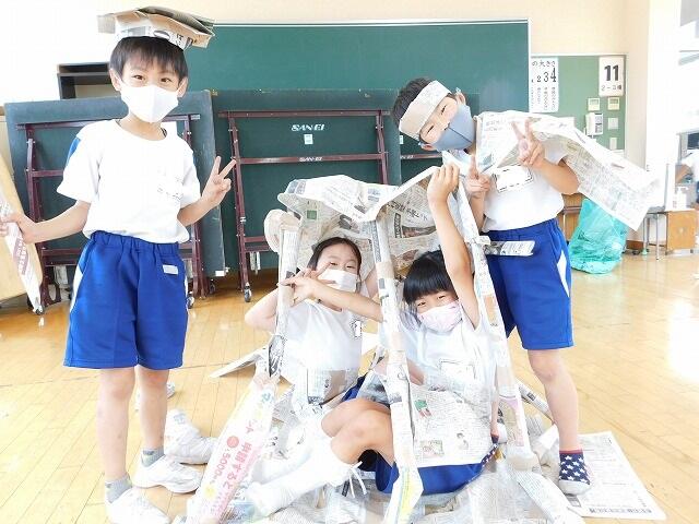 新聞紙を使うのにも慣れてきて、チームの仲間と相談して、思い思いに作品を作り上げました。子どもたちの力作をご覧下さい。