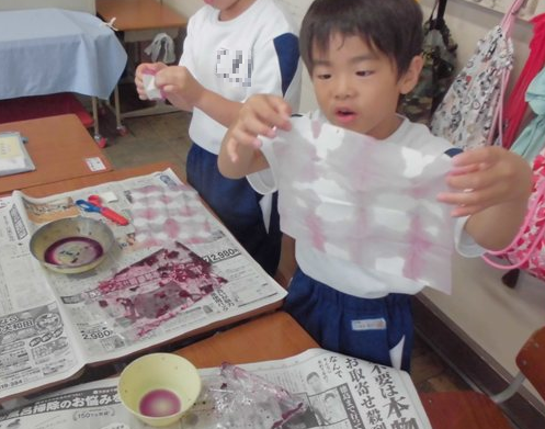 昨日は、朝顔の花を使って色水遊びをしました。紙を折って色を染ませて模様を楽しみました。