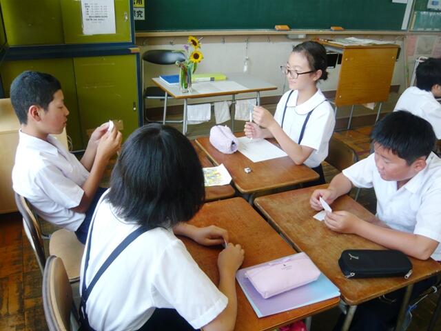 粟野中学校には、粟野小学校、粟野南小学校、黒河小学校、中央小学校の4校が、松陵中学校には、松原小学校、敦賀西小学校、沓見小学校、中央小学校の4校が集まり、2時間の授業を体験しました。初めは緊張もあり固かった表情も、グループでの活動を通して、後の方ではかなり軟らかい表情で学習に取り組むことができるようになっていました。