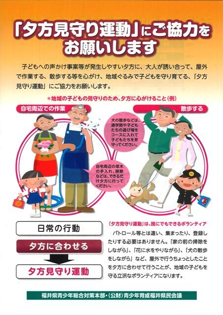 夏休み前にもご協力のお願いをさせていただきましたが、夏休み中も引き続き、子どもたちの安全のため「夕方見守り運動」のご協力をお願いします。