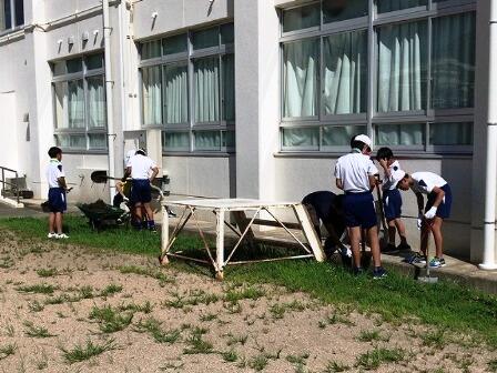 校庭や中庭、花壇などの除草、溝の掃除、植木の選定、校舎内の壁紙張り替えと分担して活動しました。