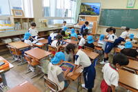 教室でランドセルや教科書、タブレットなどの説明。
