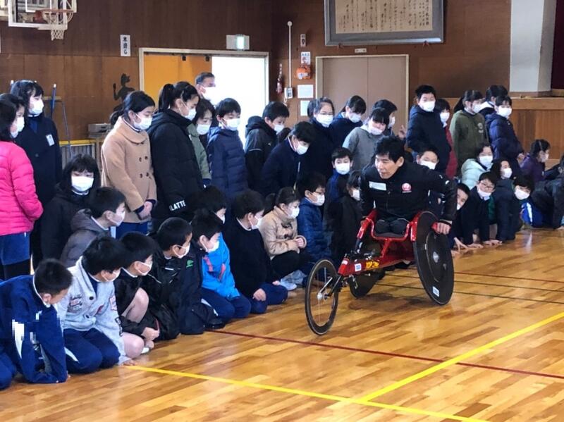 2月12日、あすチャレスクールが開かれました。今回は、パラリンピックの代表選手である、永尾選手を講師に招いて講演をして頂きました。パラリンピックの様子の動画を見せて頂いたり、いろいろな種類の競技用車いすについてお話していただきました。実際に永尾さんが車いすを操作する場面では、とても速いスピードに、「おお~!!」「すごい速い!!」などと歓声が上がっていました。