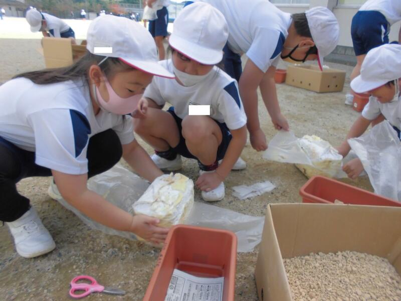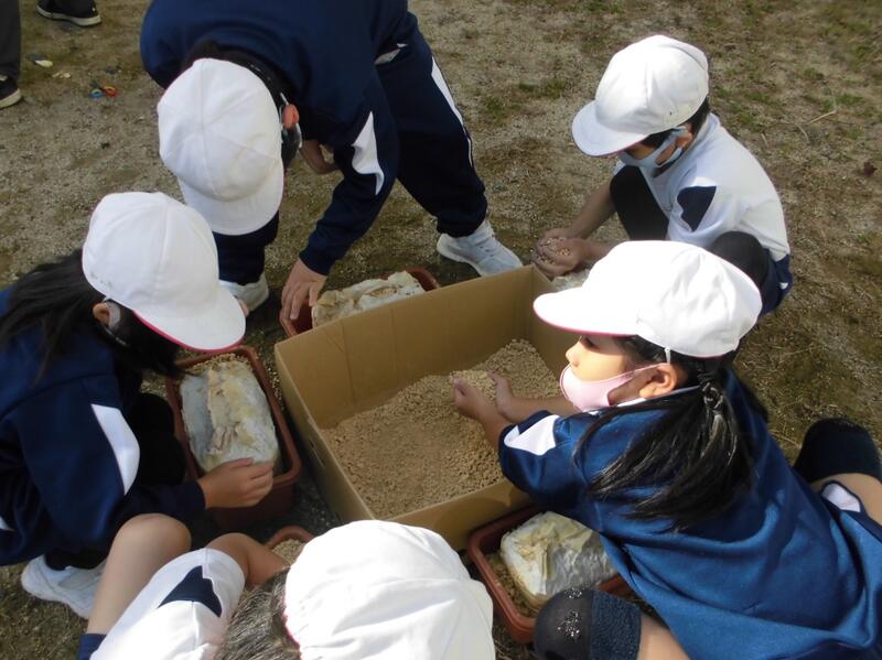 次に、カンタケ植えを体験しました。初めて見る菌床にびっくりしながらも、みんなで協力してカンタケを植えました。