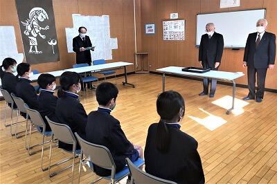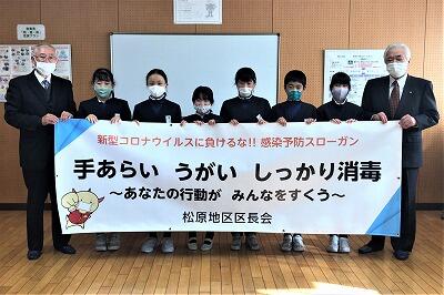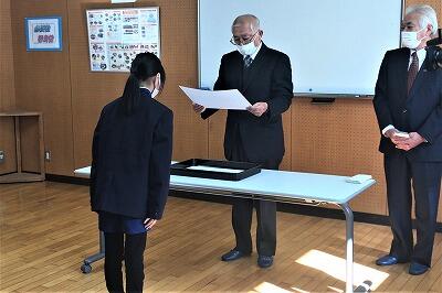 入賞の学級代表が、松原地区の区長会長さんから表彰を受けました。