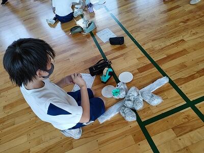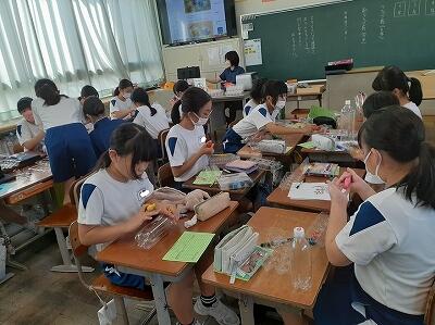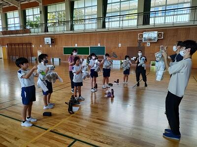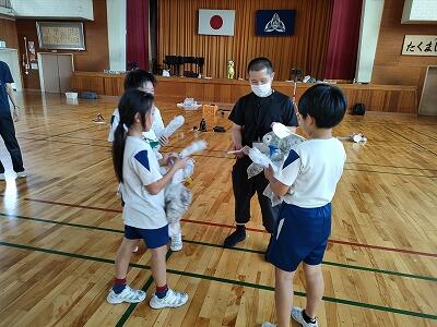文化芸術による子供育成推進事業の取組として、5年生の代表が人形劇のワークショップに参加しました。カッパの人形劇を一人一人作成し、動かし方を劇団員の方々に教えていただきました。10月の本番が楽しみです。