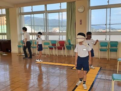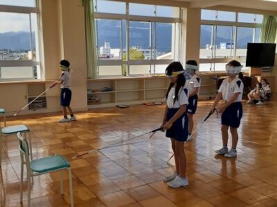 社会福祉協議会より3名のゲストティーチャーをお招きし、4年生が福祉体験講座を実施しました。アイマスクや白杖を使っての視覚障害者体験、車椅子体験、高齢者疑似体験の3つを体験しました。体験して初めて、大変さが分かったようです。子ども達にとって貴重な機会となりました。