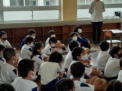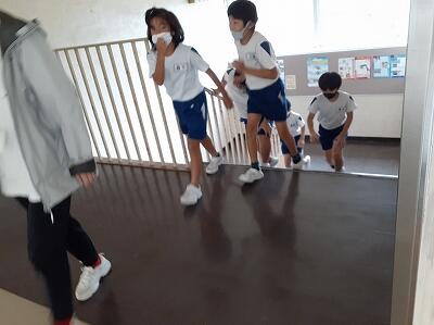 9月21日(水)、水害垂直避難訓練を実施しました。線状降水帯等の大規模降雨により本校も浸水する恐れがある、という想定の下、1~2階の児童と教職員が北校舎3階に避難しました。