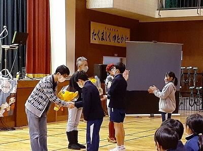 児童会長からお礼の言葉を、6年生から花束を贈りました。