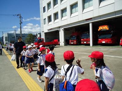 行く途中、消防署の前を通り、たくさんの消防車を発見!道路の点字ブロックも見つけました。