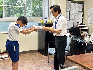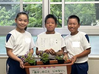 運営委員の3人が、みんなを代表して校長室で、目録とプランターに入った花の苗を受け取りました。
