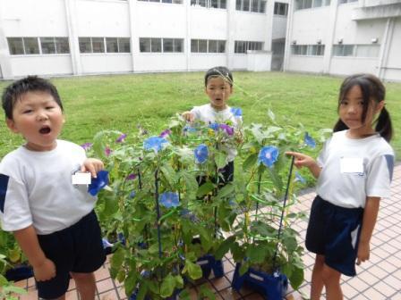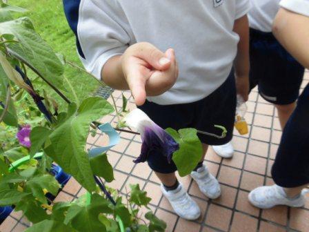 「先生、朝は青色の朝顔だったのに、帰りは赤紫にかわってるぅ!」