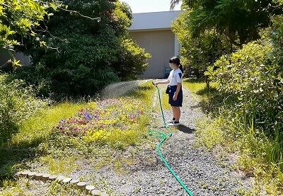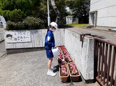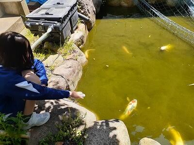 飼育栽培委員会は、校門前や中庭の花の水やり、いこいの池にいる鯉の餌やりをしています。
