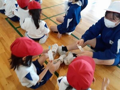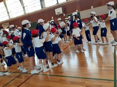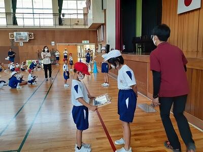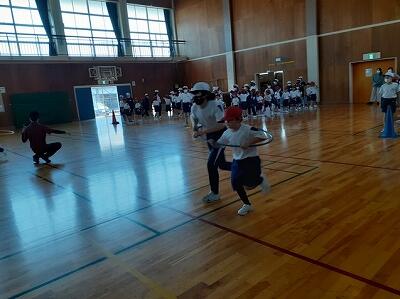 1つ目は、フラフープリレー。6年生と1年生が、フラフープの中に入って仲良く走りました。