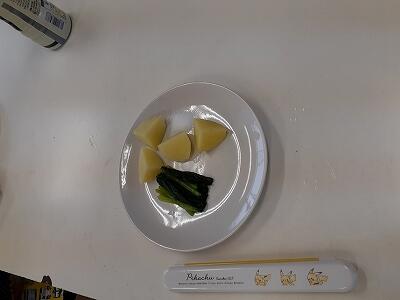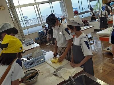 5年生が家庭科で調理実習を行いました。今回は、「ゆでる」学習です。じゃがいもの皮むき、包丁で切る、じゃがいもやほうれんそうをゆでるなど、グループごとに役割分担しながらつくっていました。