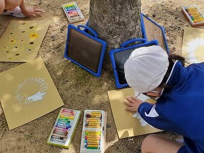 図工では、写生の色塗りをしていました。タブレットで撮った写真を参考にしたり、外の景色を眺めて色を確認したりしながら塗っていました。