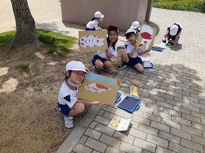 2年生が、写生をしに松島第4公園(こい公園)へ出かけました。先日の雨で池が濁り、残念ながら鯉は池にはほとんどいませんでした。川にいる鯉をえさで引きつけて写真をとり、写真を見ながら鯉の絵をかきました。
