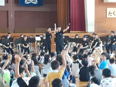 体育館から迫力ある音楽がきこえてきたので行ってみると、敦賀気比高等学校、付属中学校吹奏楽部の皆さんが、中央児童クラブの子どもたちのためにコンサートを開いてくださっていました。