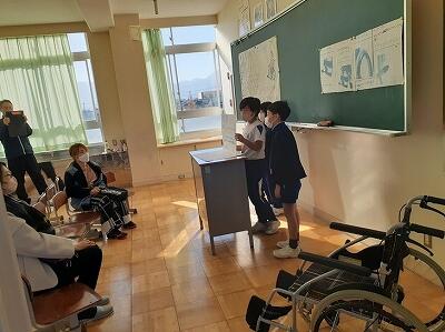 4年生。総合「みんなで支える町」で、福祉について学んだことをワークショップ形式で発表しました。